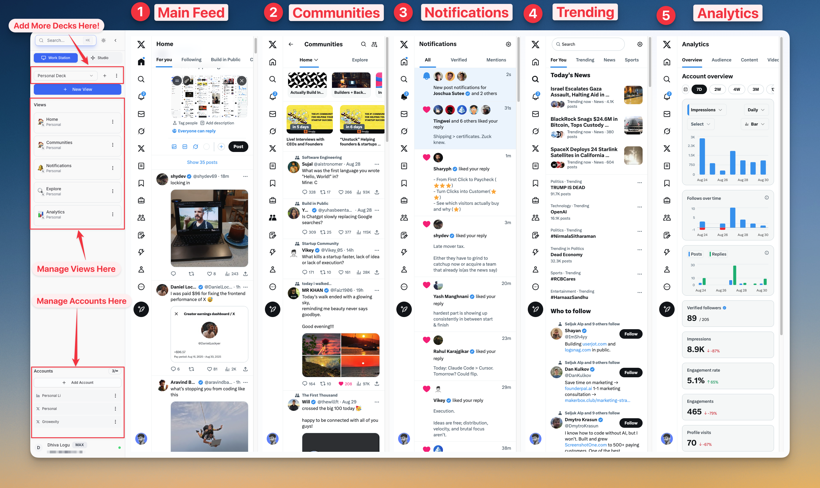 Stop the tab-switching madness. See timeline, mentions, DMs, and analytics simultaneously in organized columns. Like TweetDeck, but for everything.